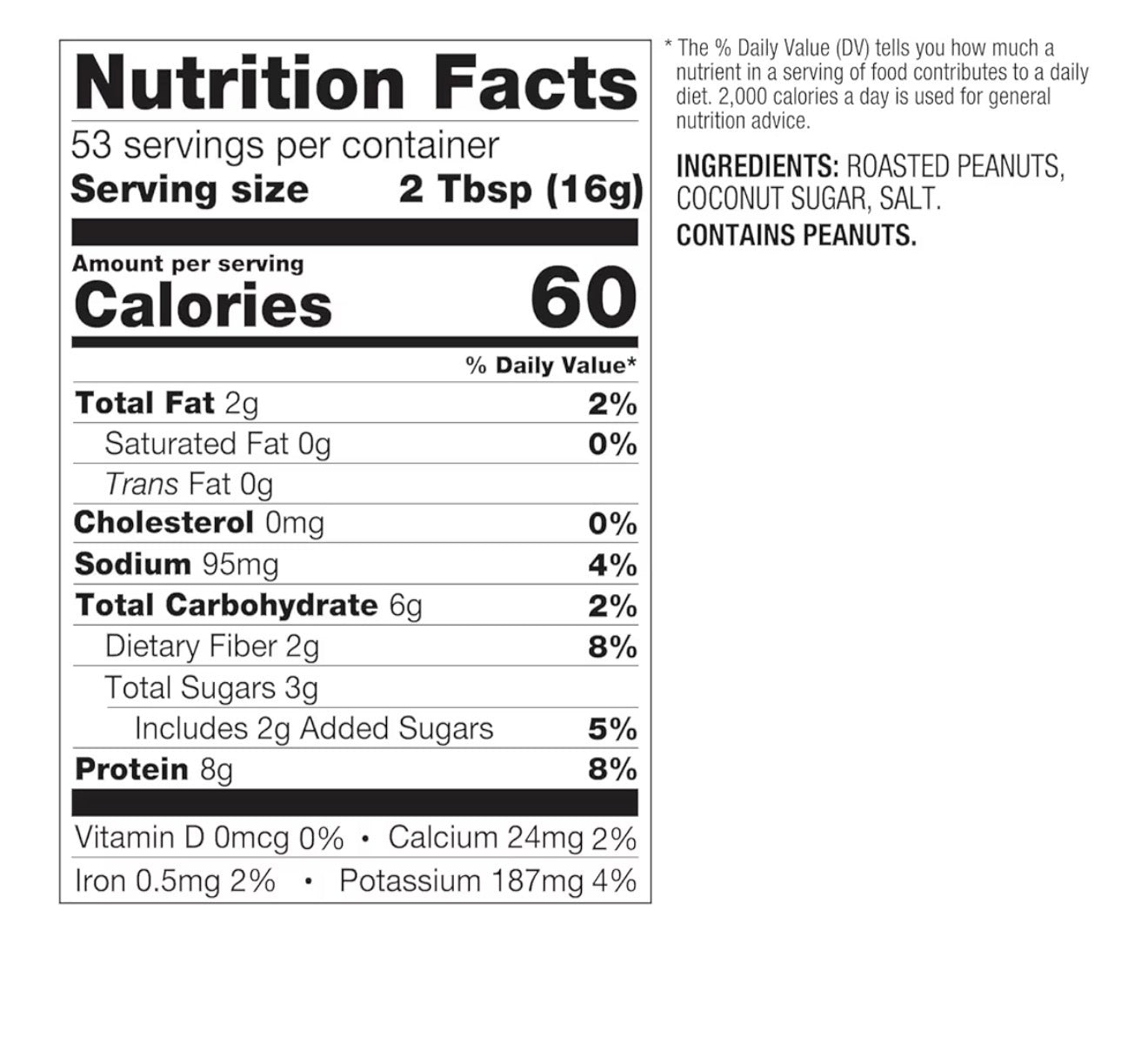 MANTEQUILLA DE MANÍ EN POLVO, INGREDIENTES NATURALES. 60 CALORÍAS POR PORCIÓN. 30 OZ, 8 GR DE PROTEINA POR PORCIÓN.
