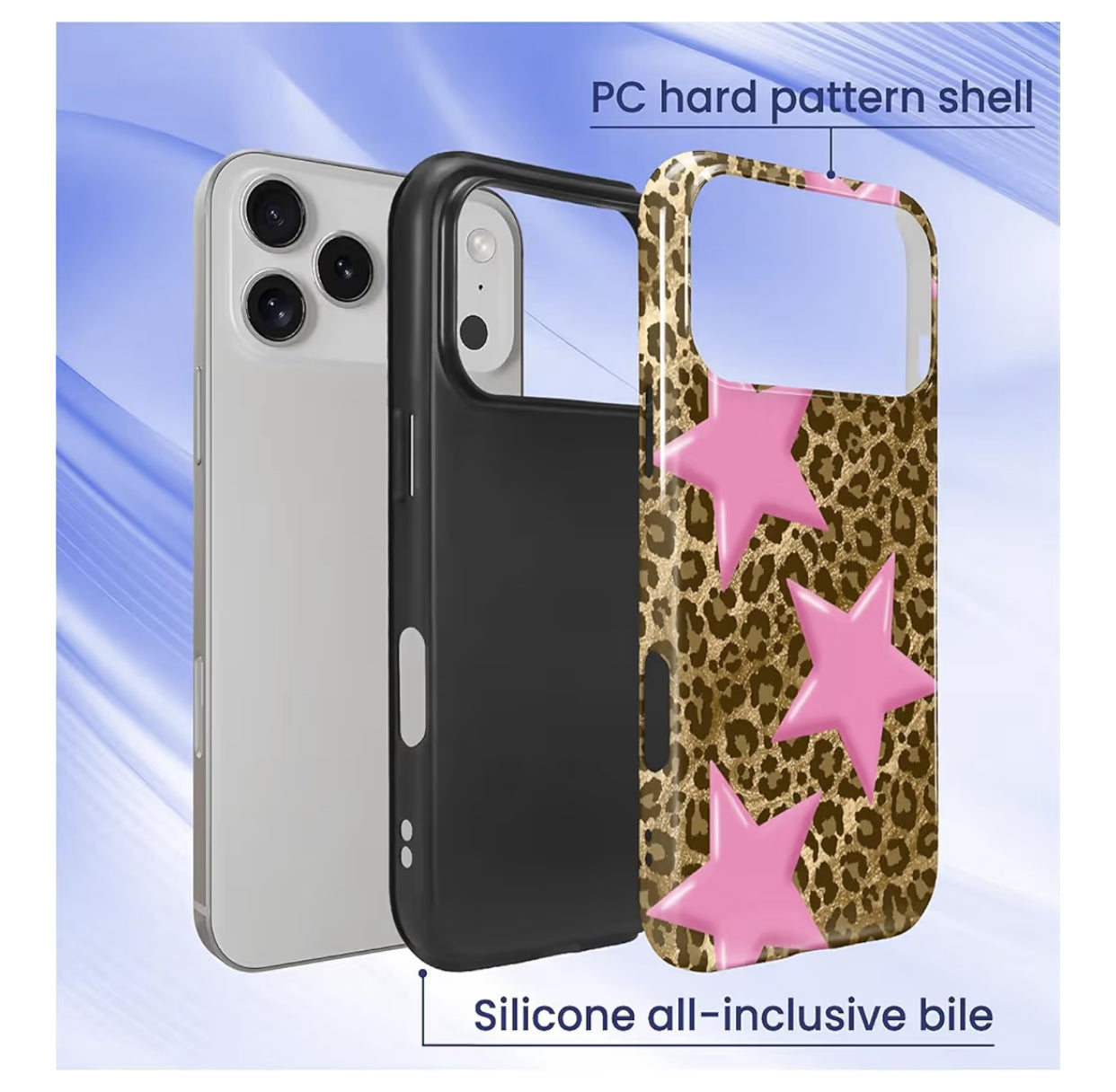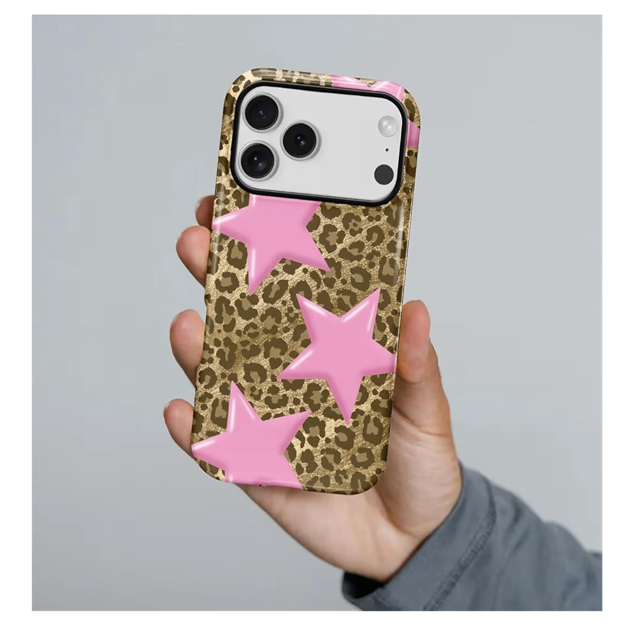 CARCASA PROTECTORA CON ESTAMPADO DE LEOPARDO Y ESTRELLAS ROSADAS, DOBLE PROTECCIÓN A PRUEBA DE GOLPES.