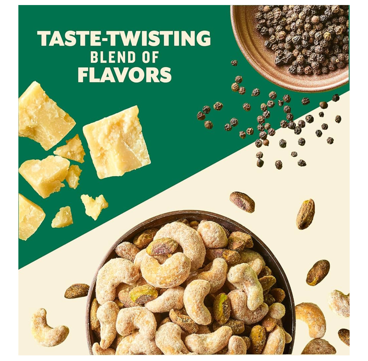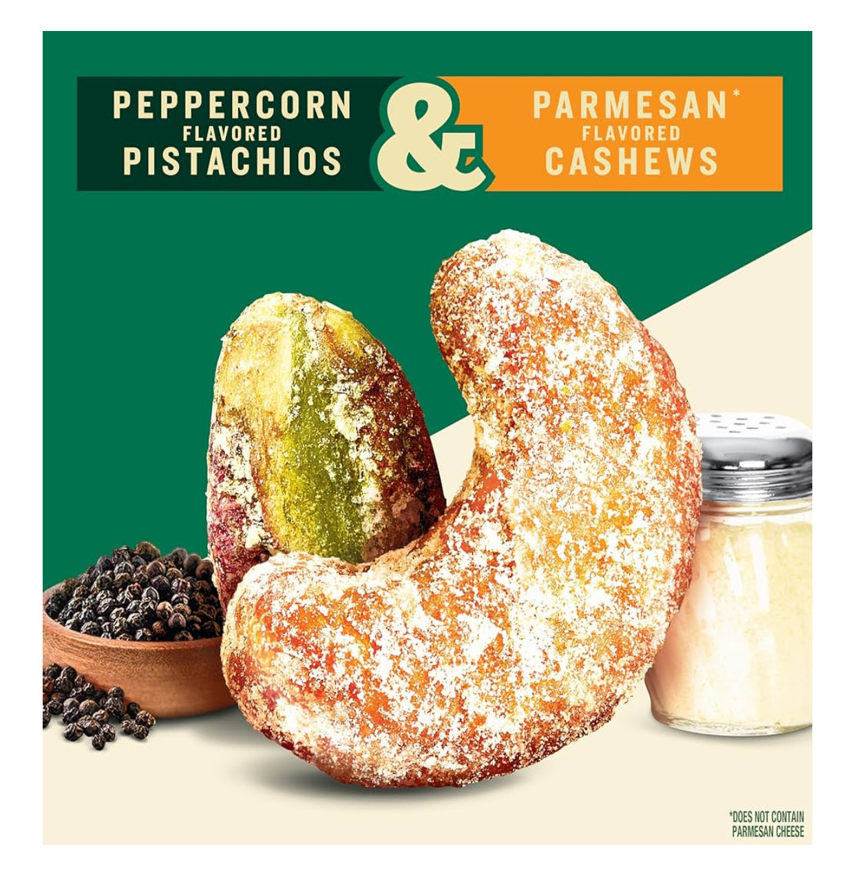 PLANTERS NUT DUOS, PEPPERCORN PISTACHOS MEZCLADOS CON MARAÑONES SABOR PARMESANO. 5 OZ