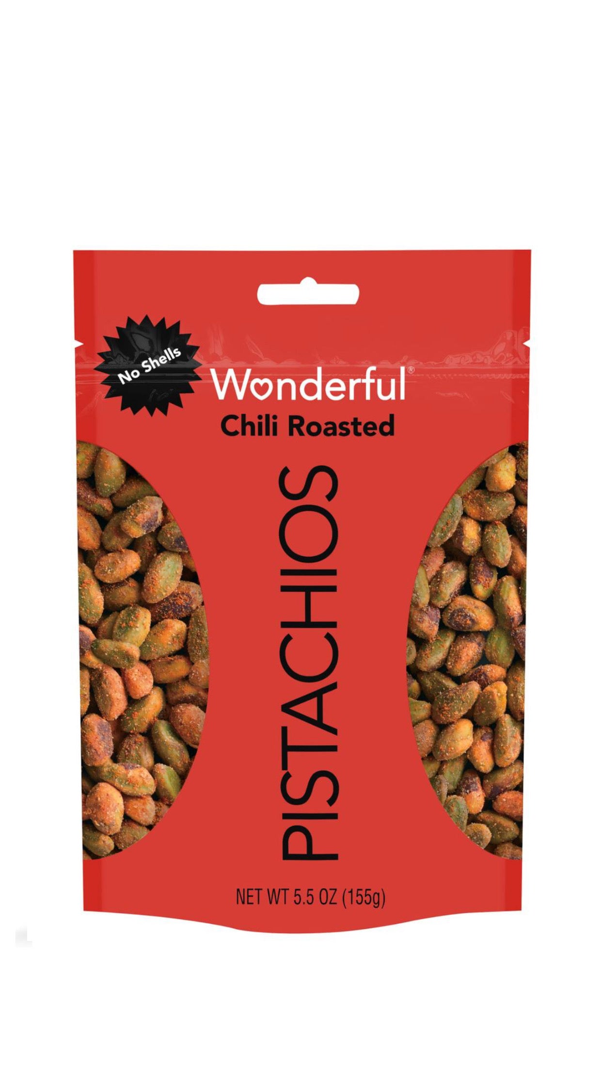 WONDERFUL PISTACHOS SABOR CHILI ROASTED. SIN CONCHAS. 11 OZ, GLUTEN FREE, PROTEÍNA A BASE DE PLANTAS. HEART HEALTHY.