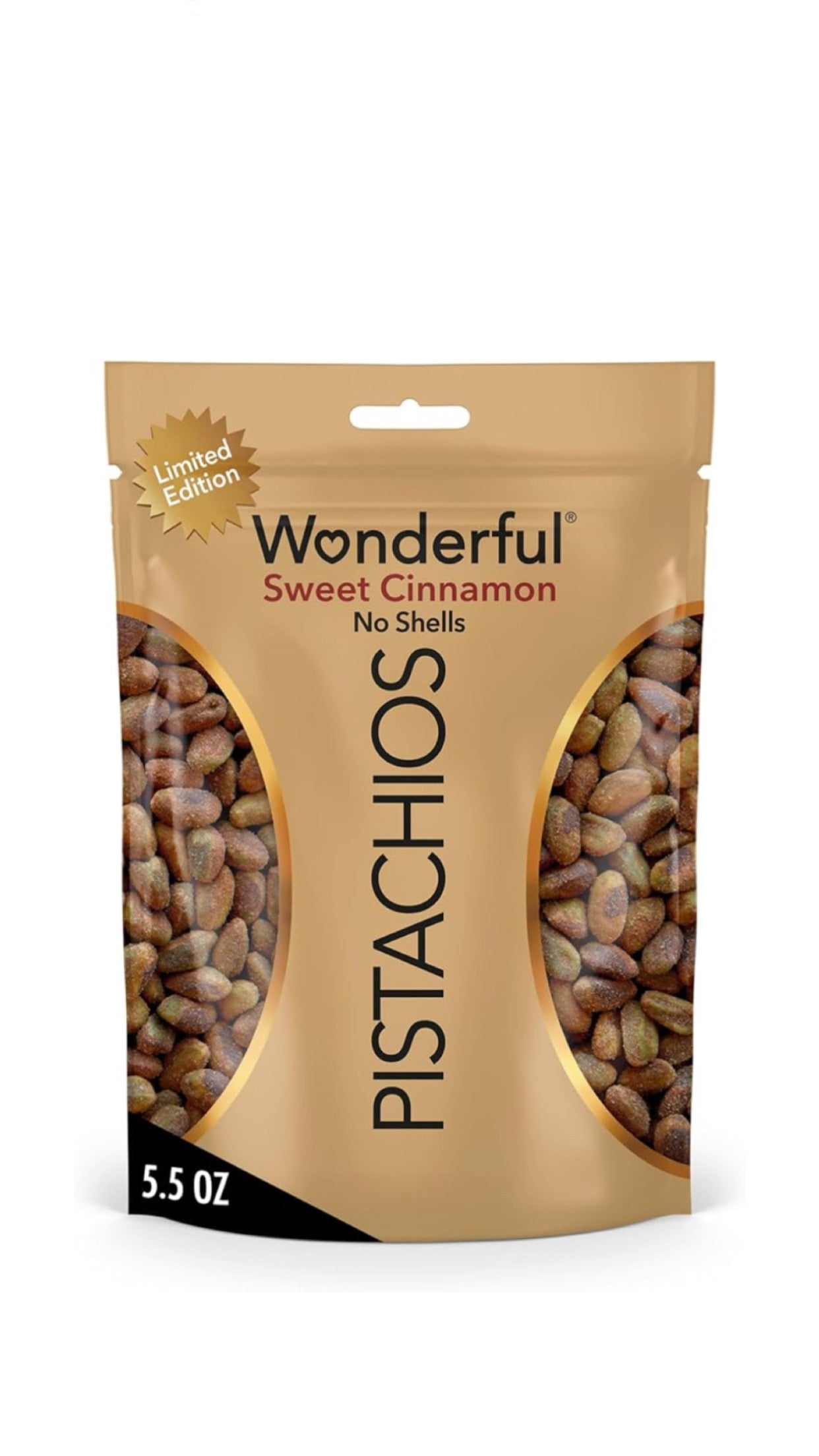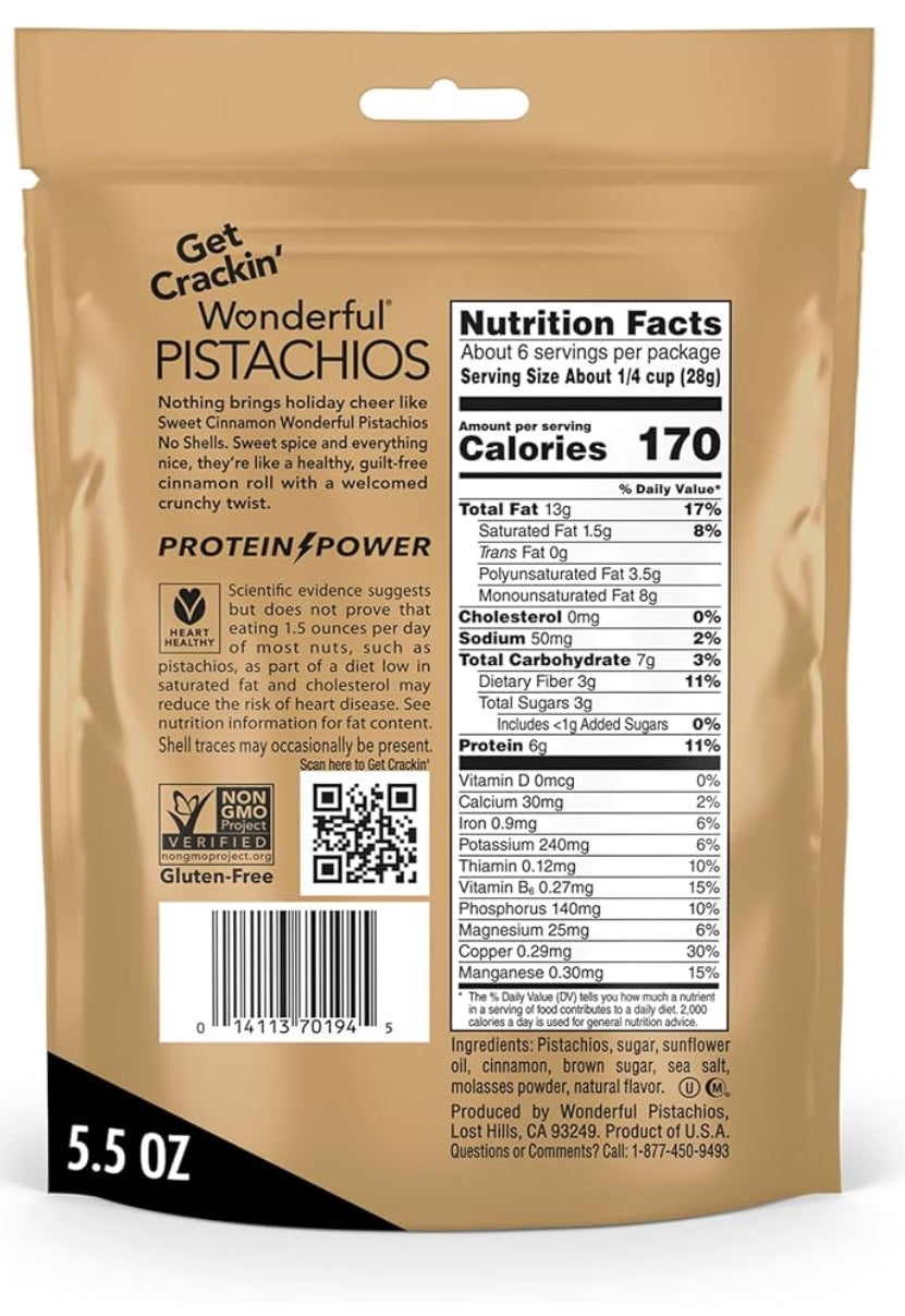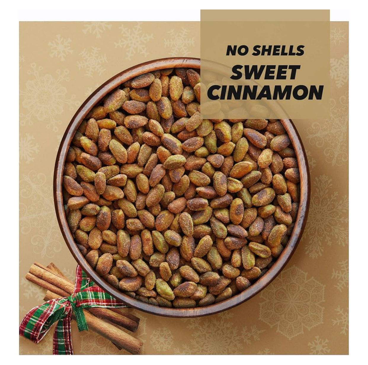 PISTACHOS SIN CÁSCARA SABOR A CANELA, 5.5 OZ EN BOLSA RESELLABLE. SNACK ALTO EN PROTEINA, NO CONTIENE GLUTEN.